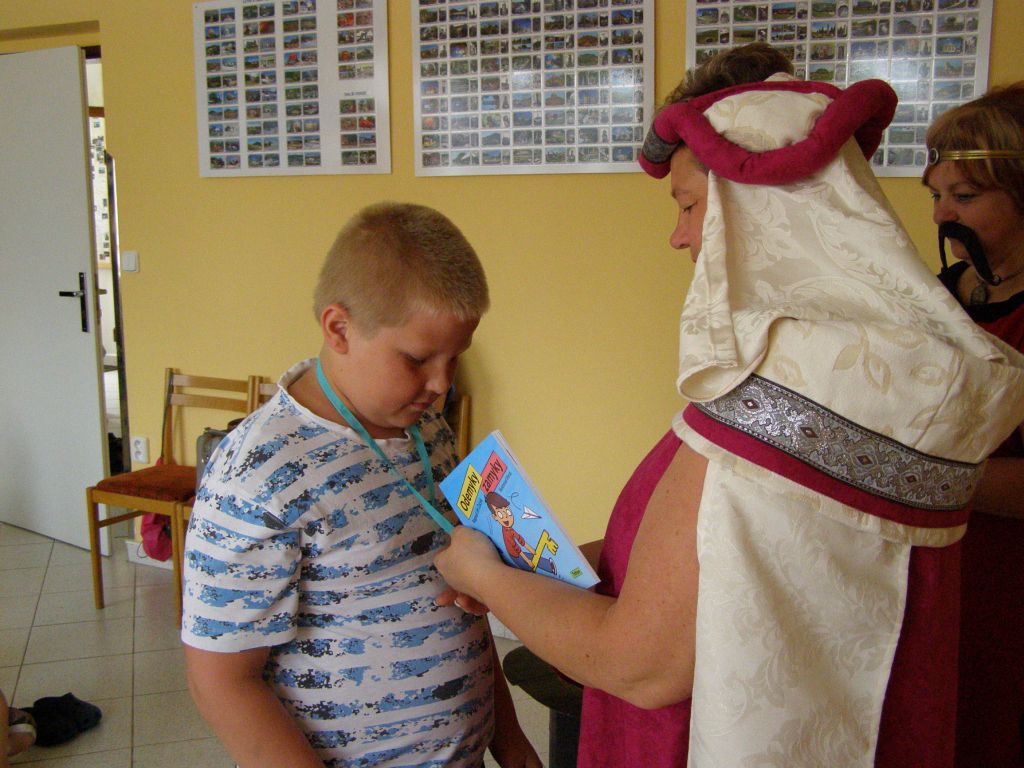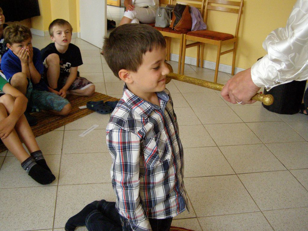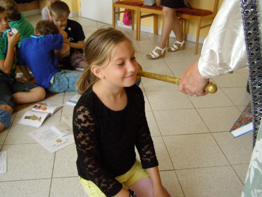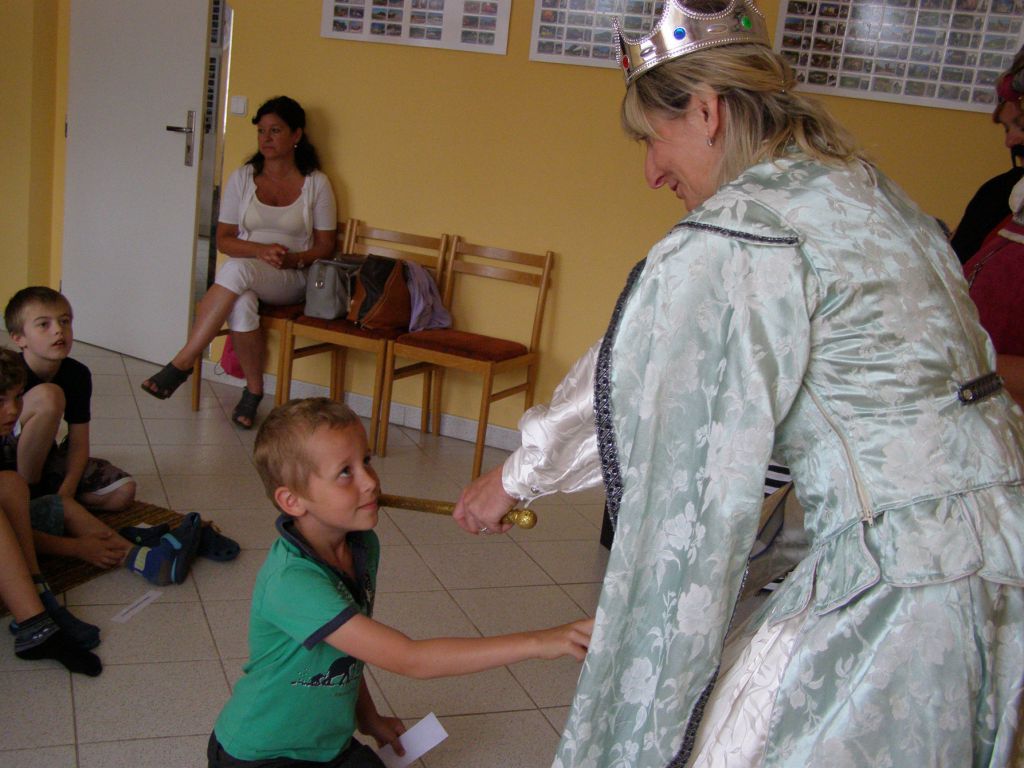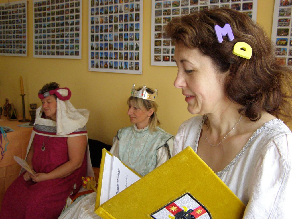Žáčci první třídy v rytířském sále, před královskou družinou plnili úkoly paní Abecedy.