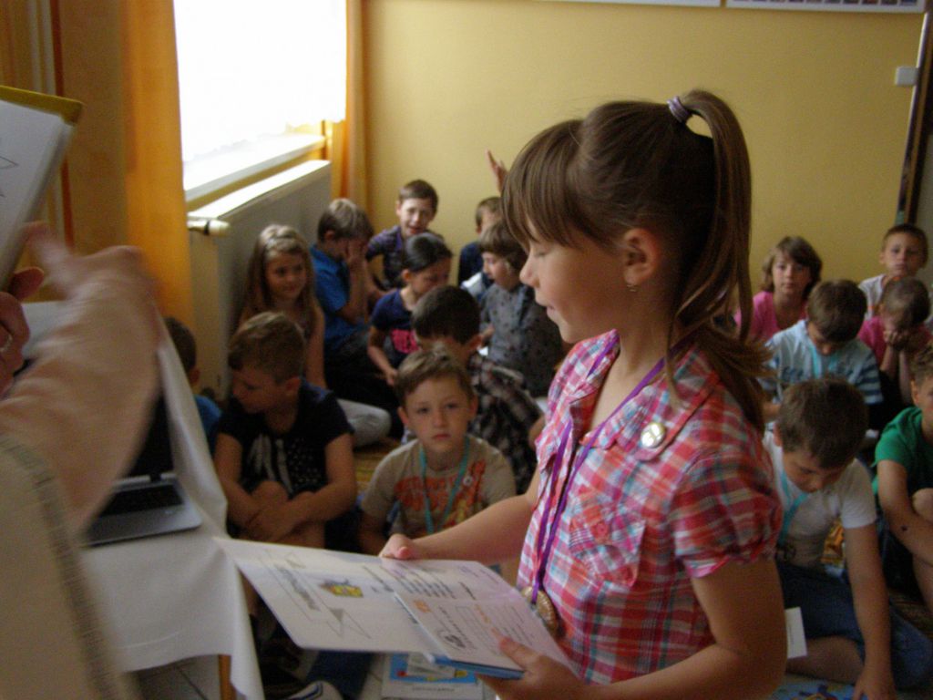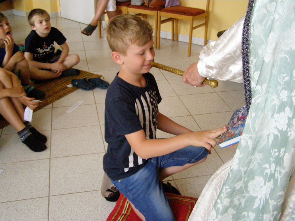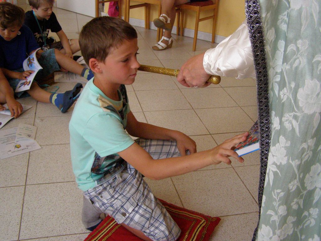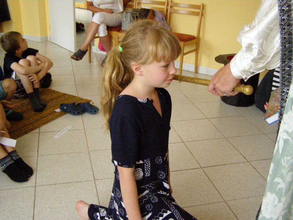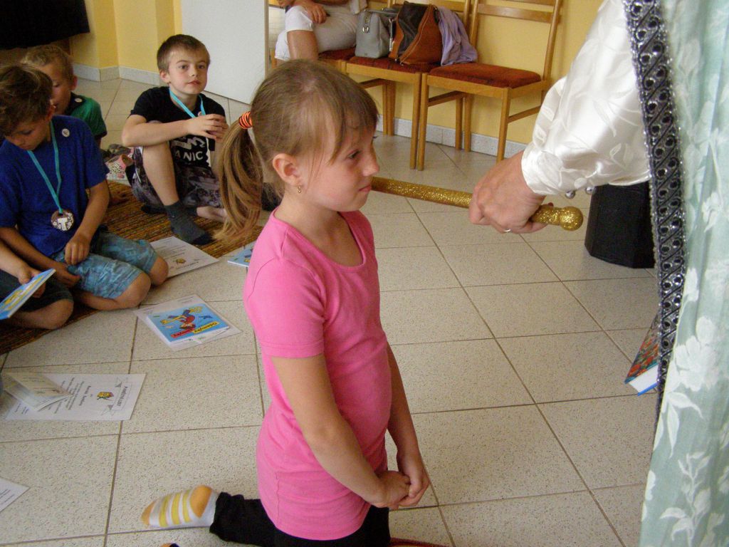 Žáčci první třídy v rytířském sále, před královskou družinou plnili úkoly paní Abecedy.