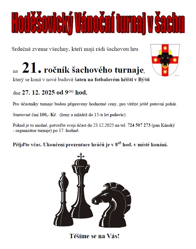 Bude to v sobotu 27. 12. od 9°° hodin. Hrát se bude švýcarským systémem pod vedením zkušeného rozhodčího. Předpokládá se odehrání sedmi kol s přestávkou na oběd zhruba do 18. hodiny.
