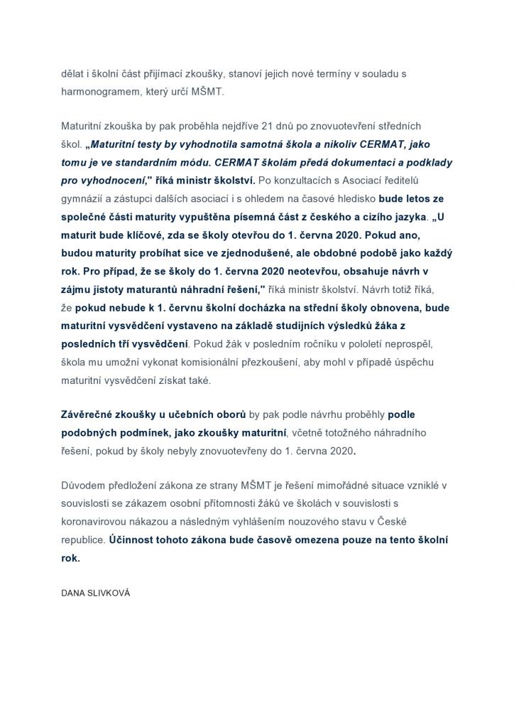 Jednotná přijímací zkouška na střední školy pro školní rok 2020/2021 by tak mohla proběhnout nejdříve 14 dnů ode dne obnovení osobní přítomnosti žáků při vzdělávání ve středních školách.