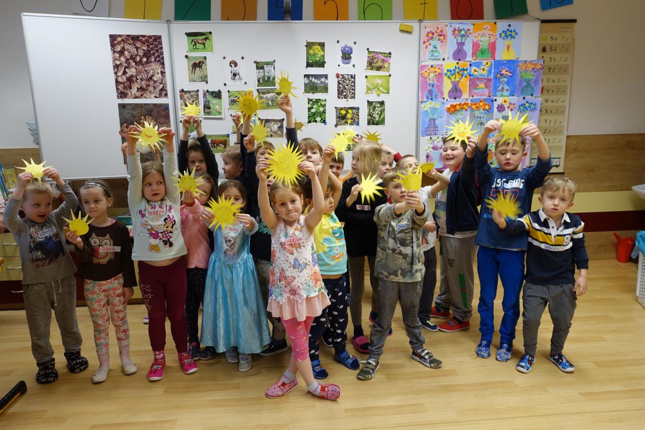 Po přivítání s předškoláčky jsme si zazpívali a zacvičili s písničkou Hřej, sluníčko, hřej. Poznávali jsme na obrázcích zvířecí rodinky. Dokázali jsme napodobit i jejich řeč. Někteří předváděli zvířata (například slepici, krávu a včelu) a ostatní je hádali. Zažili jsme spoustu legrace. Také jsme určovali jarní květiny. Každý si vytvořil sluníčko, které si ozdobil vlastnoručně vystříhanými paprsky. Hledali jsme správné trojice ve hře Pexetrio. Všichni jsme se naladili na přicházející jaro. Všechny holky i kluky chválíme, protože byli moc šikovní.