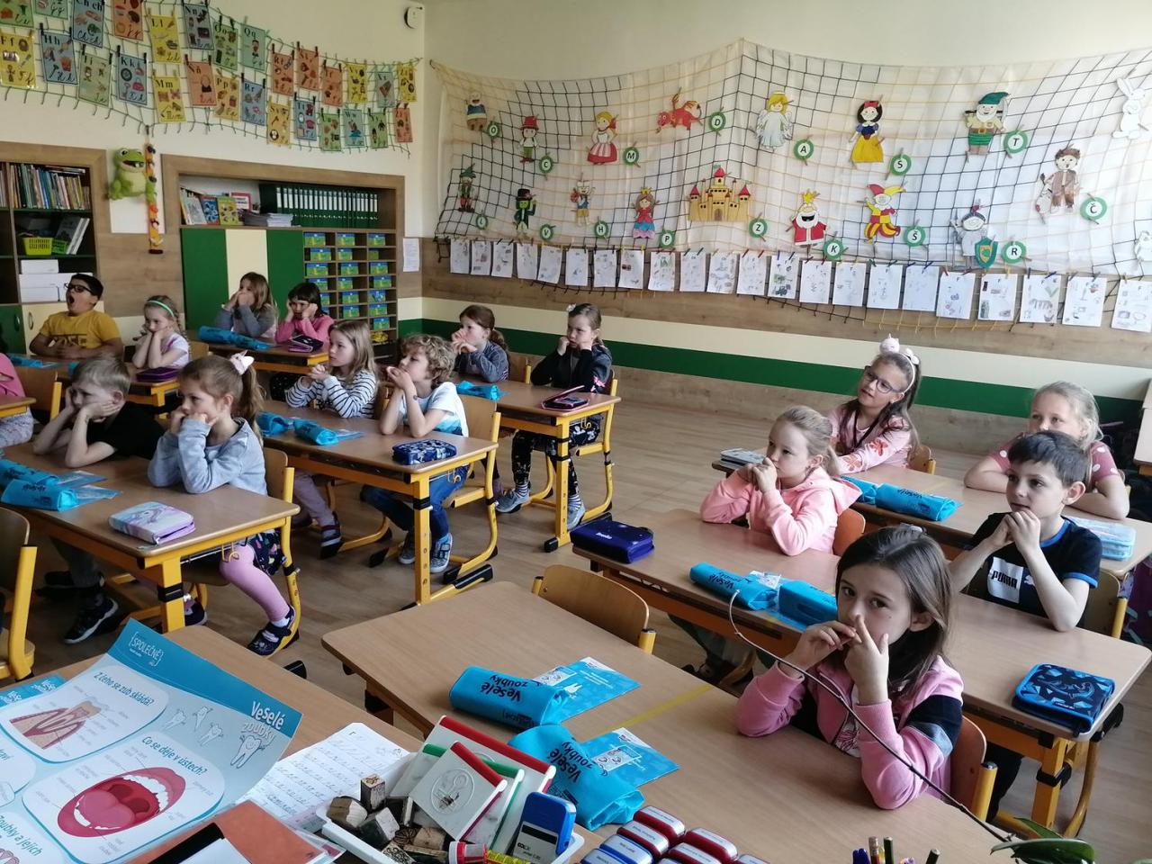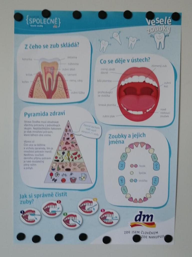 Proběhla diskuze, jak se o zuby máme starat a proč je to důležité. Co vše potřebujeme doma mít k péči o zdravý chrup, jak často si máme měnit zubní kartáček, jak často máme chodit na preventivní prohlídky. I to, že je důležitá pestrá zdravá strava. Nyní již víme, jak vypadá dětský „mléčný“ chrup a z jakých částí se každý zub skládá. Bavil nás i krátký film „Jak se Hurvínkovi podívat na zoubek“. Nakonec si každý z nás odnesl domů i dáreček. Krásnou taštičku, ve které měl samolepku správné techniky čištění zubů, zubní kartáček a pastu, žvýkačky bez cukru, přesýpací hodinky a pracovní listy.