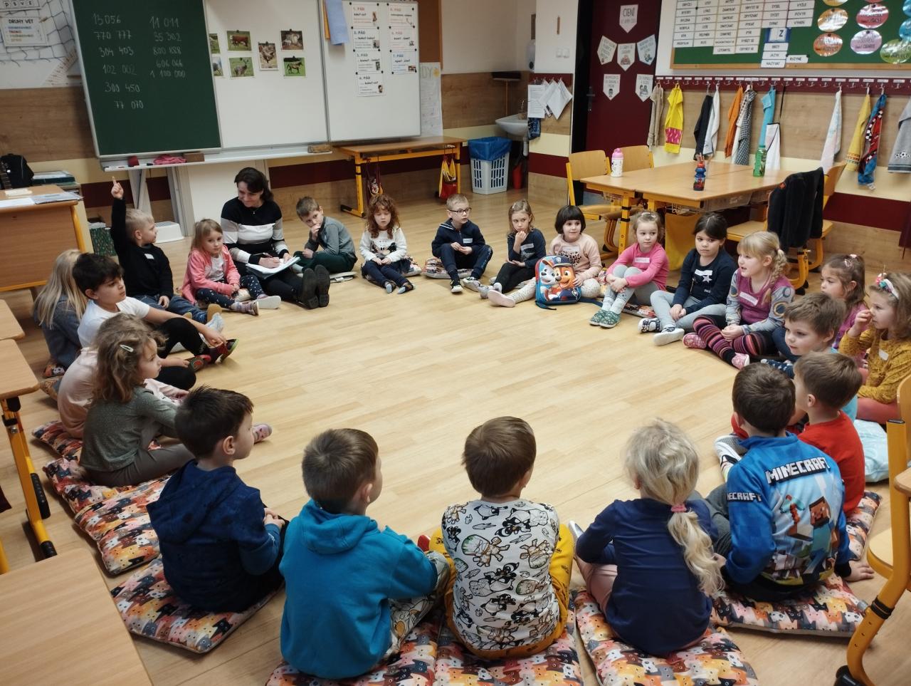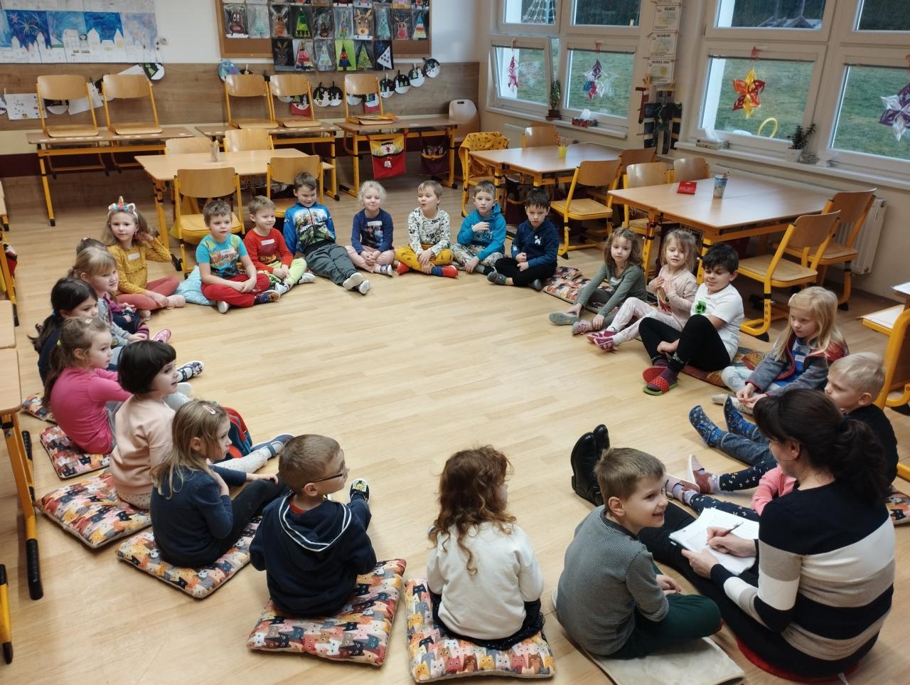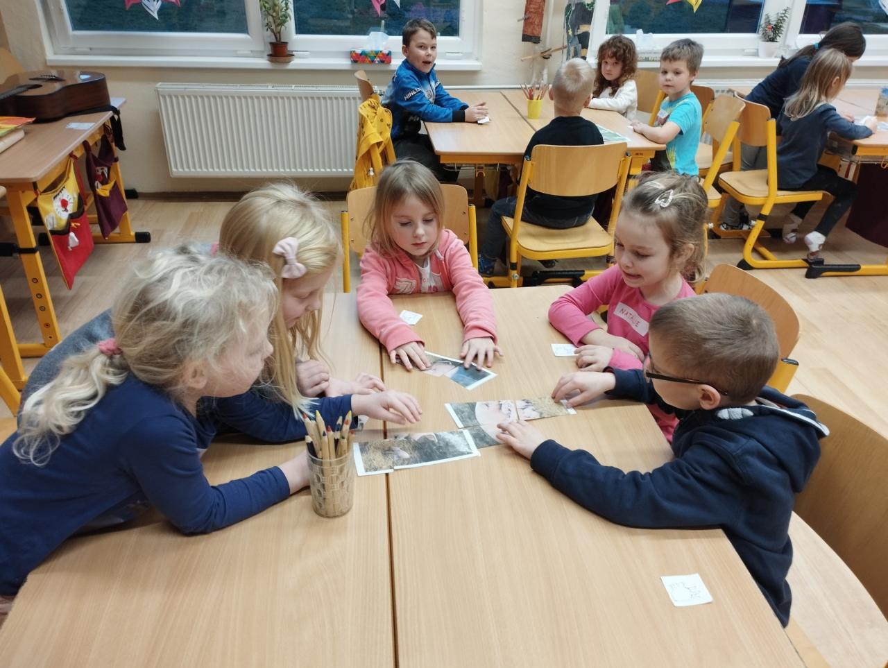 Po úvodním představení, kdy každý předškoláček řekl své jméno a kde bydlí, jsme si povídali o zvířátkách. Zpívali jsme písničky s doprovodem kytary, naučili jsme se novou říkanku o broukovi. Děti se rozdělily podle vylosovaných zvířátek do skupin a skládaly obrázky svého zvířete. Pak jsme si ukázali správné držení tužky a trénovali jsme jemnou motoriku grafomotorickými cviky. Většina dětí se na svůj pracovní list zvládla i podepsat. Na závěr děti prokázaly, že znají většinu zvířat i jejich mláďat.