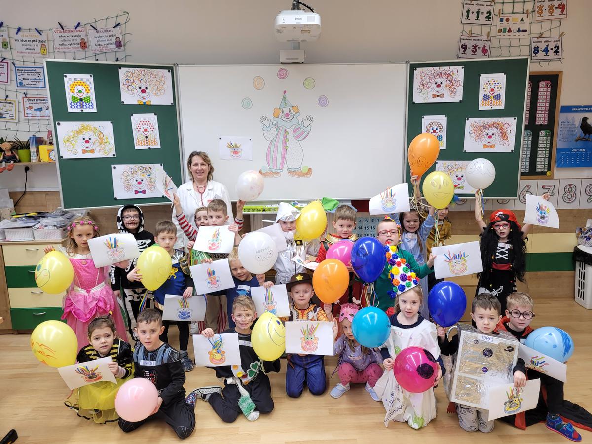 Aby nezahálely ani naše ručičky, šli jsme si vyzdobit každý svého klauna, kterému jsme lepili vlasy a také ho hezky vybarvili. Kdo měl tuto práci hotovou, pustil se do balónkového tvoření. Namaloval si klauna na balónek a paní učitelky mu pak pomáhaly s upevněním vlasů.