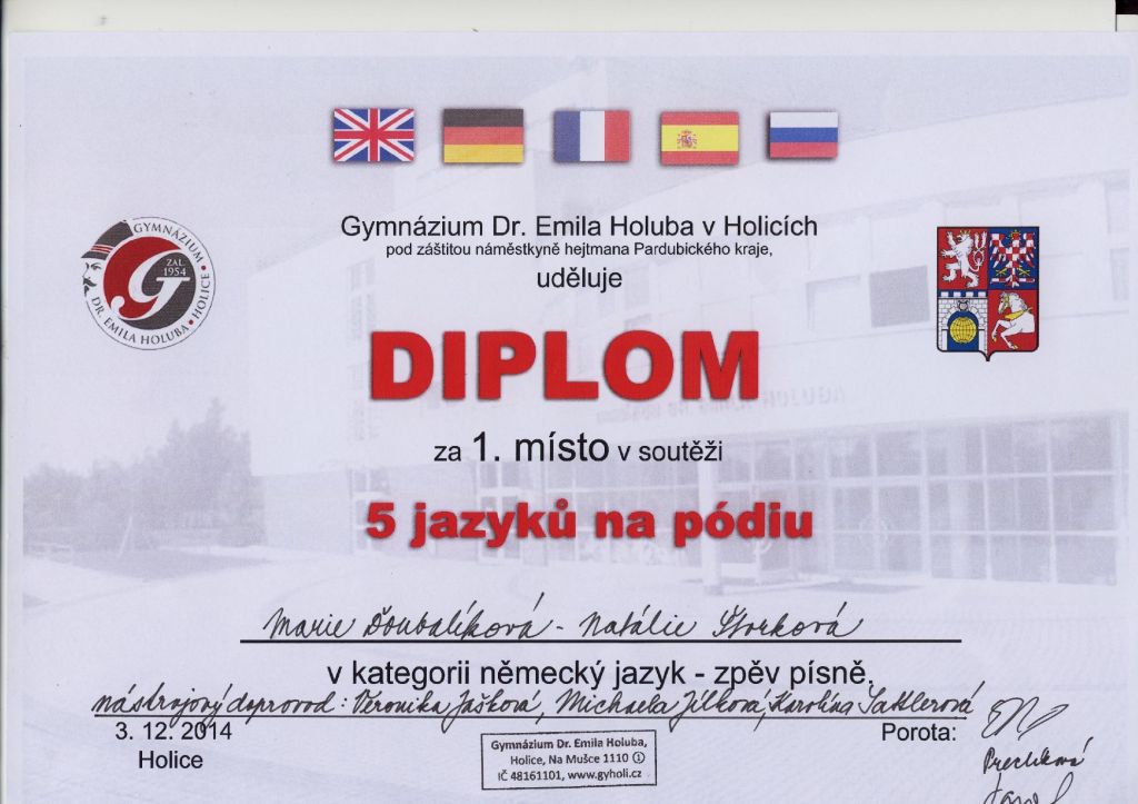 Dívky Marie Ďoubalíková, Natálie Štorková, Veronika Jašková, Michaela Jílková a Karolína Sattlerová soutěžily dokonce ve dvou kategoriích, a to zpěv v německém jazyce a zpěv v anglickém jazyce. Jejich vystoupení posuzovaly vždy mezinárodní poroty. V kategorii zpěv v německém jazyce vyzpívala děvčata navzdory velké konkurenci první místo. Tímto jím patří gratulace a poděkování za vzornou reprezentaci naší školy. Vítěznou píseň si budete moci poslechnout při vánočním jarmarku ve tři hodiny u stromečku.
